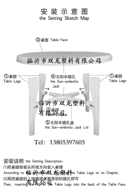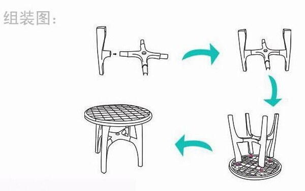 關于拼裝通過下面的示意圖可以看出基本的步驟。實際操作中首先是桌腿與桌撐的組合,通過預留的卡槽,首先手持桌撐將桌腿卡入,一次重復四次將四條桌腿安裝完畢。然后將桌面反向放置于平整地面,將組合好的桌腿與桌撐,對準卡槽,推入四條桌腿,這樣一個完整的塑料桌子就組裝好了。拆卸過程同樣簡單,指示把上述流程反向操作即可。